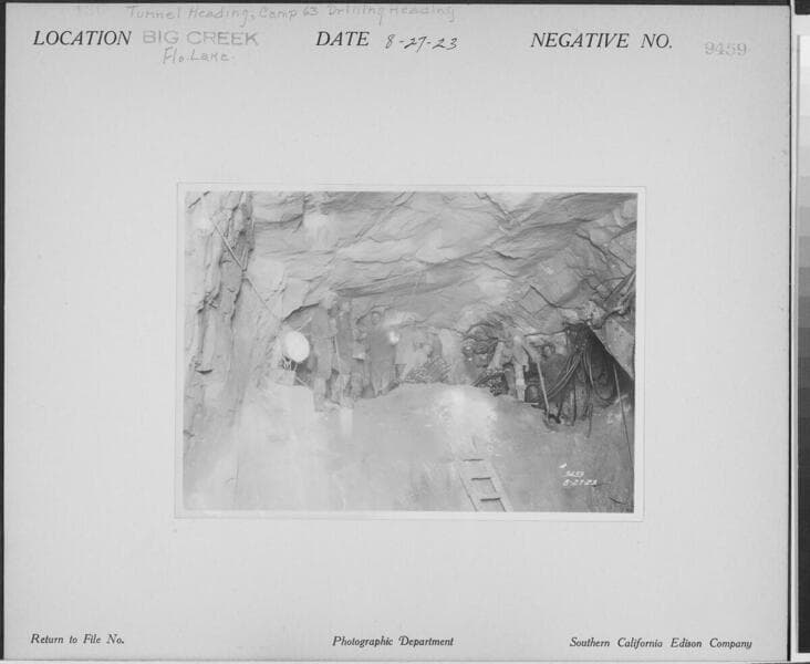 Big Creek, Florence Lake Dam - Miners in Florence Tunnel "Heading Bench, Camp 63, Big Creek".