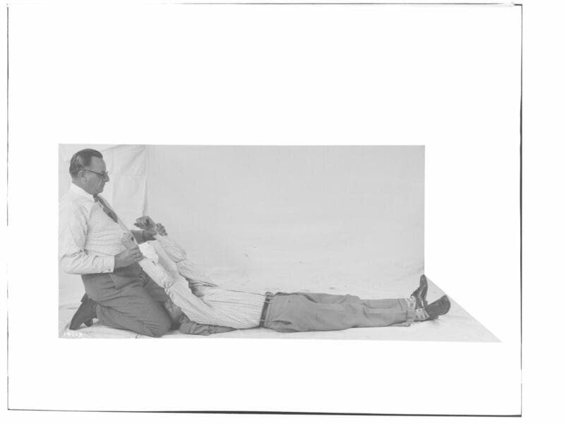 A1.7 - "Safety First" - Artificial respiration, first position. [Two men conducting a first aid demonstration. They appear to be on the roof of the General Office].