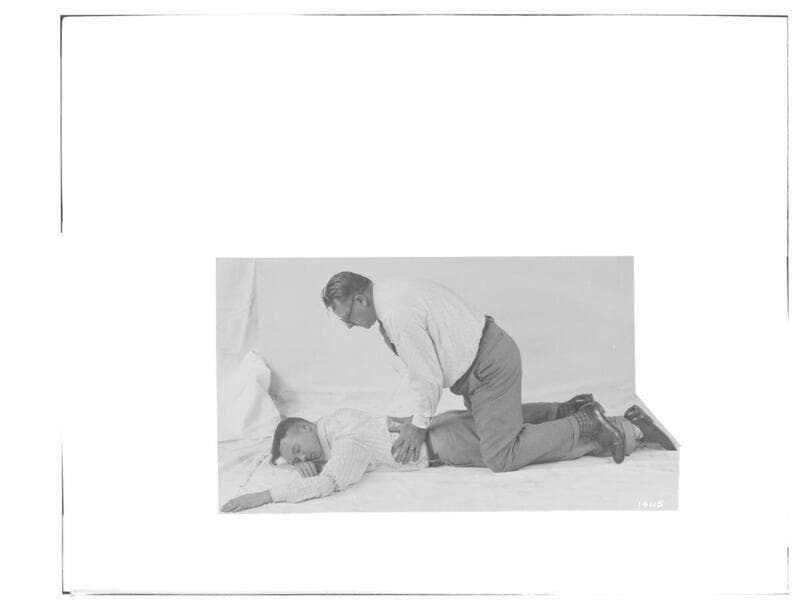 A1.7 - "Safety First" - Artificial respiration, first position. [Two men conducting a first aid demonstration. They appear to be on the roof of the General Office].