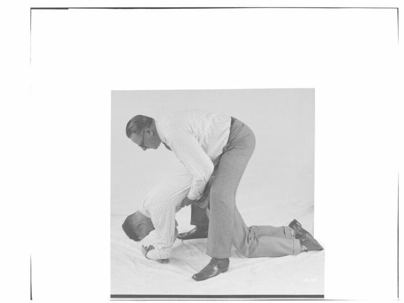 A1.7 - "Safety First" - Artificial respiration, first position. [Two men conducting a first aid demonstration. They appear to be on the roof of the General Office].