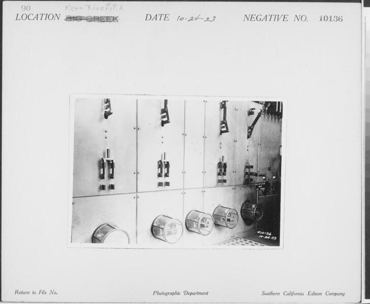 Kern River No. 1 - Powerhouse interior - Switchboard and electrical switches.