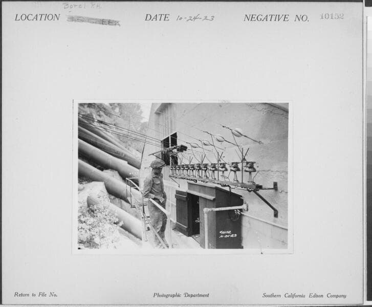 Borel powerhouse and penstocks. [Sign for Kern River Company on front of powerhouse]