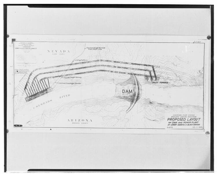 Colorado River - Boulder Dam from Arizona side, reservoir side, showing intakes.