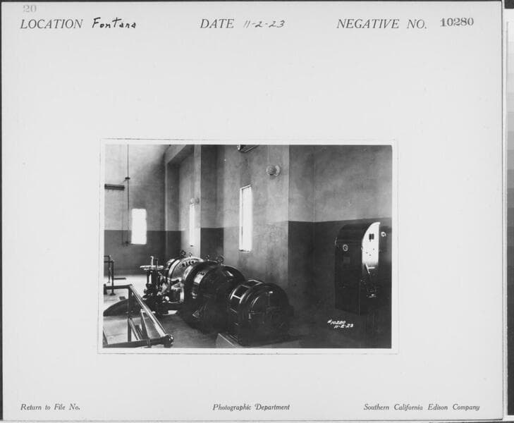 Lytle Creek, Fontana Powerhouse - Interior shot [showing two units and the switchboard on generator floor at Fontana Powerplant.]