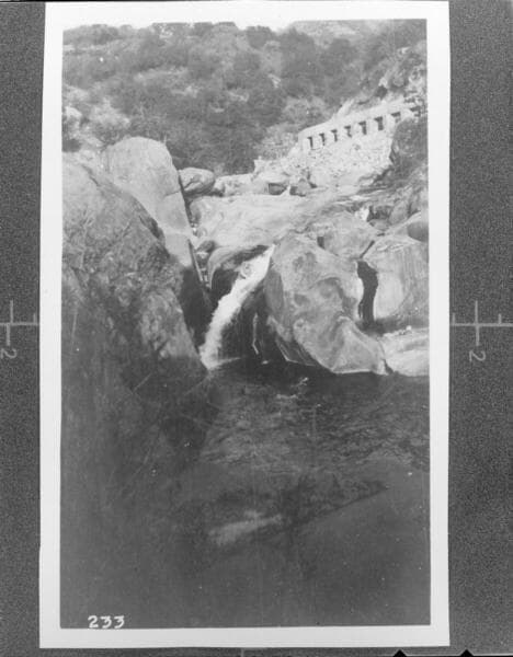 The Middle Fork branch conduit at Kaweah #3 Hydro Plant, showing water flowing into a river.