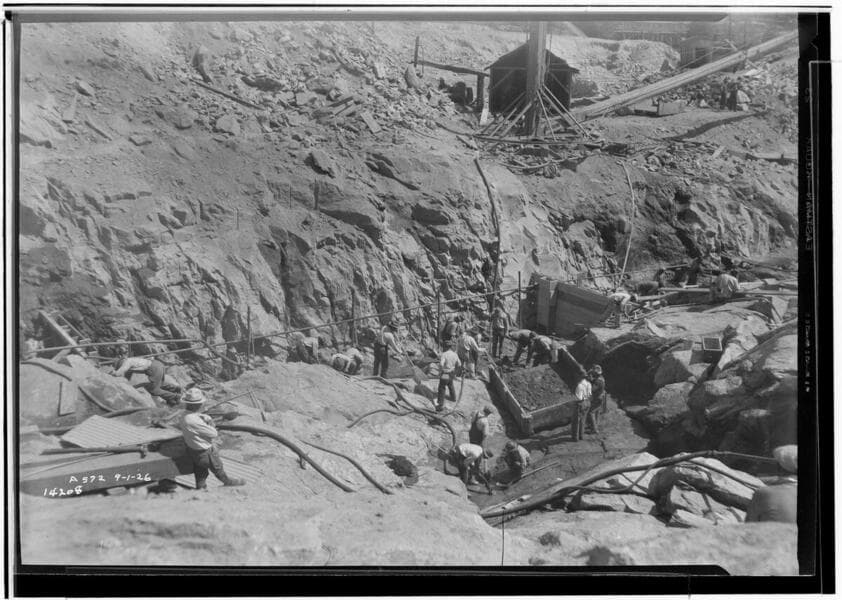 Big Creek, Shaver Lake Dam - Stevenson Creek - Close-up view of cutoff trench immediately north of first section being poured. The bridge in upper part of picture was used for transporting.