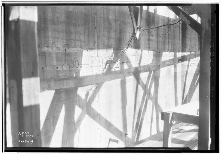 Big Creek, Stevenson Creek Test Dam - [construction shot showing wires from dam for monitoring load stress.].