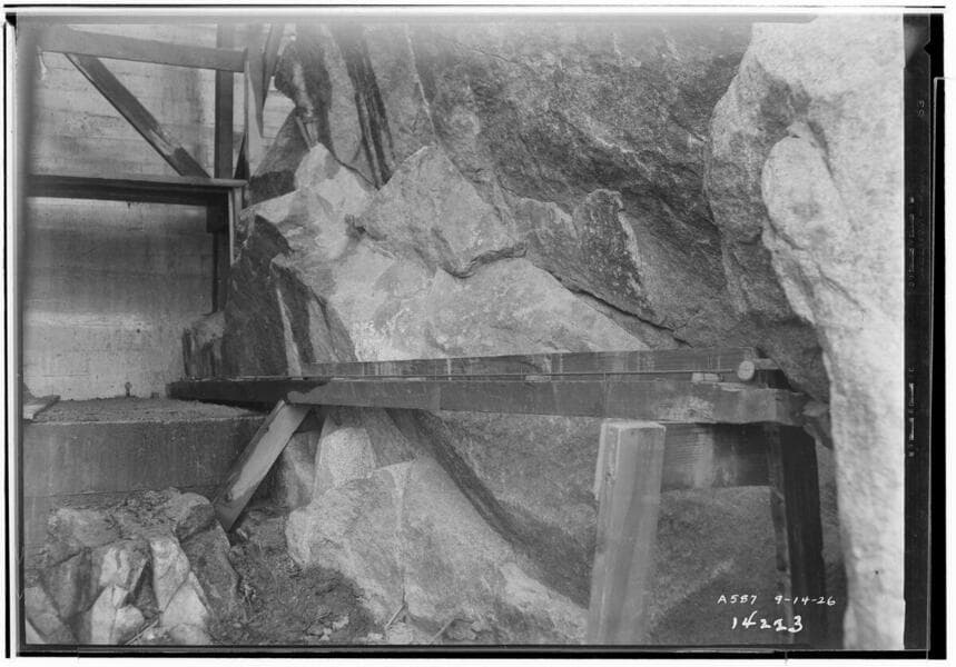 Big Creek, Stevenson Creek Test Dam - [Construction. Close-up of framework for dam with wires exposed for remote monitoring of load stress.].