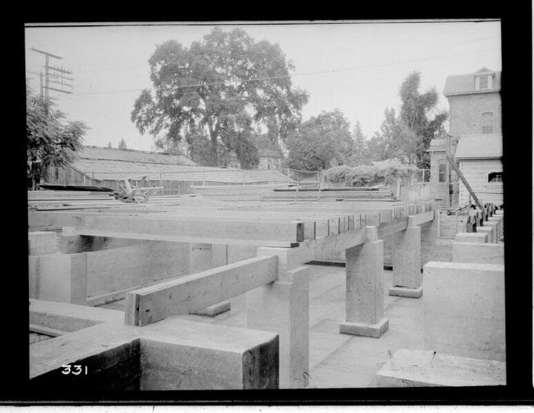 A construction crew working on the construction of the Visalia Local Office Building, ca. 1911.