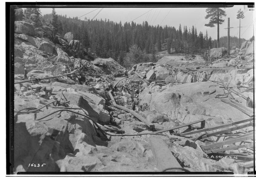 Big Creek, Shaver Lake Dam construction site - looking across excavation for dam.