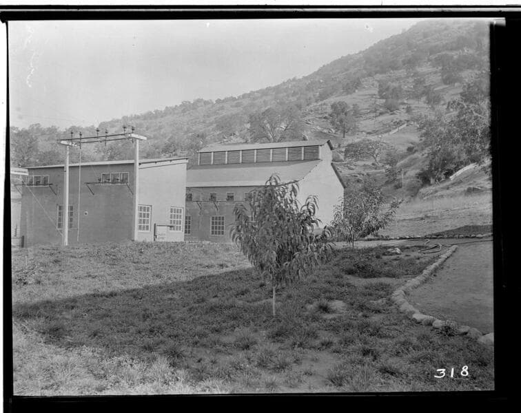 The flume at Tule Hydro Plant where it leaves the P.G. & E. power house at Wishon Forks. At that time, it was the end of the road.
