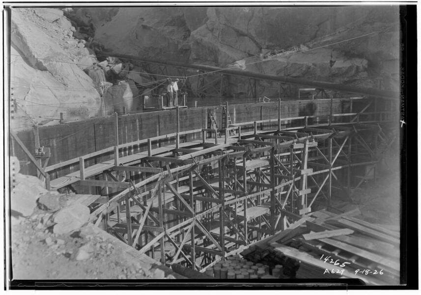 Big Creek, Stevenson Creek Test Dam - [View from downstream showing men with safety harnesses on platform in reservoir at top of dam.].