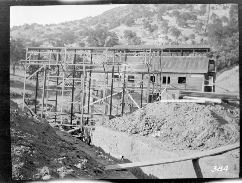 The power house of Tule Plant while under construction. A large pipe is sitting in the foreground.
