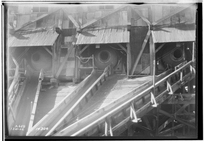 Big Creek, Shaver Lake Dam - Showing front view of Smith mixers and the arrangement of the hoppers on the double compartment Lakewood Tower.