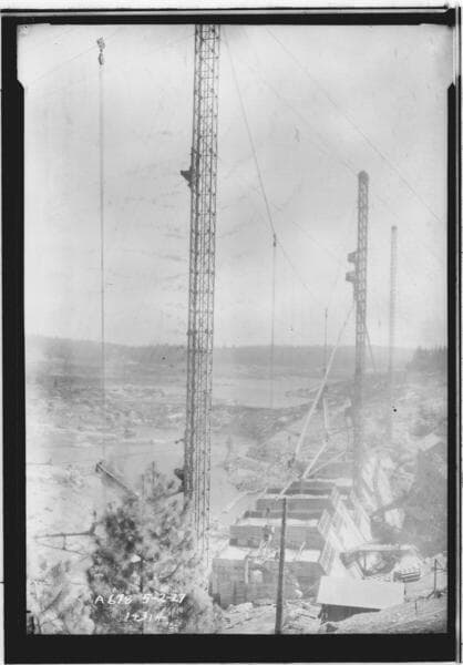 Big Creek, Shaver Lake Dam - Looking south across top of Shaver Lake Dam. - Status of construction early in second season. Chuting system, mixing plant, cement-handling facilities, and original Shaver Dam are shown.