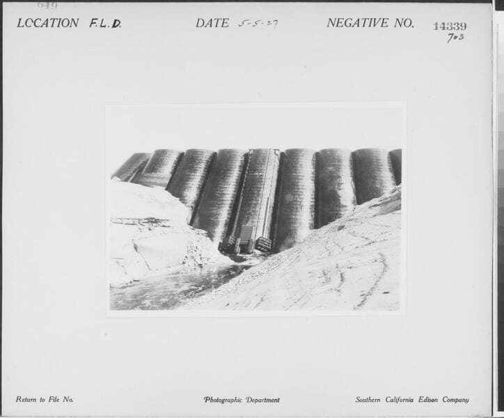 Big Creek, Florence Lake Dam - View of upstream side of river section arches showing plant layout and forms for west sluice gate extension.