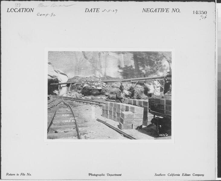 Big Creek, Mono-Bear Diversion - Camp 82 at the outlet of the Mono and Bear Tunnels; showing topography and tent house cabins.