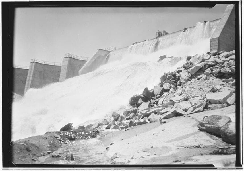 Big Creek, Florence Lake Dam - View from river, taken at 11:15 A.M., showing spill below drum gates of Florence Lake Dam.