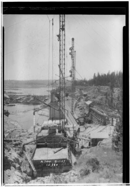 Big Creek, Shaver Lake Dam - Looking south across Shaver Dam [during construction].