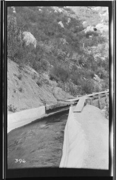 The head of the flume at Tule Plant, showing a construction camp built around the flume.