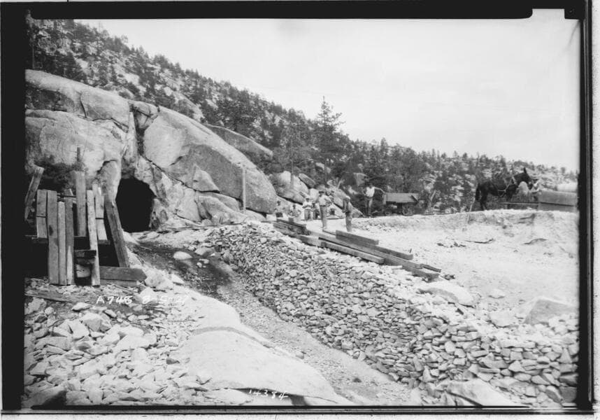Big Creek, Mono-Bear Diversion - Mono tunnel outlet at left, and Bear tunnel outlet at right, at the north end of the Mono-Bear Siphon. (Powder shown at point of truck delivery, for transfer by car to magazine.) - Camp 82 .