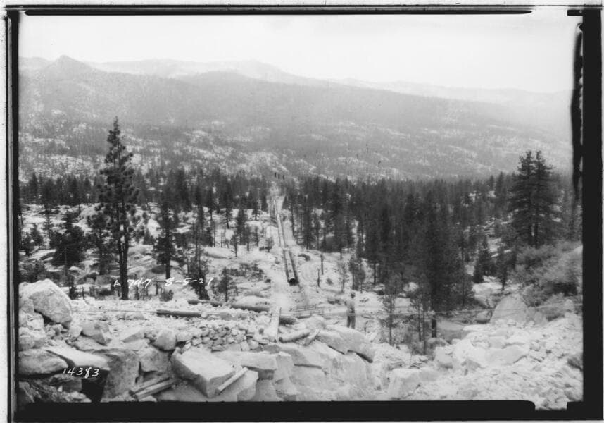 Big Creek, Mono-Bear Diversion - Looking north along Mono-Bear Siphon towards south fork San Joaquin River at a point about half way between Camp 62 and the river, showing pipeline going through two short tunnels. .
