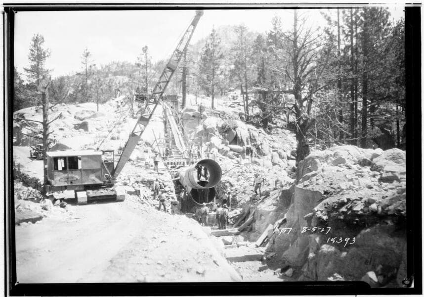Big Creek, Mono-Bear Diversion - Temporary Mono-Bear Siphon diversion pipe outside of Camp 62 Adit.