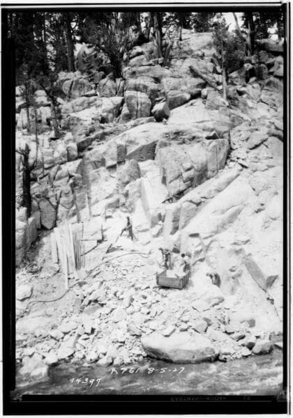 Big Creek, Mono-Bear Diversion - Mono tunnel outlet at left, and Bear tunnel outlet at right, at the north end of the Mono-Bear Siphon. (Powder shown at point of truck delivery, for transfer by car to magazine.) - Camp 82 .