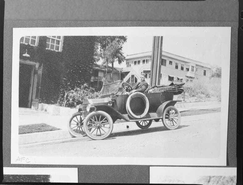 Monrovia Substation - Cottage by sub. with Model B coupe parked in front.