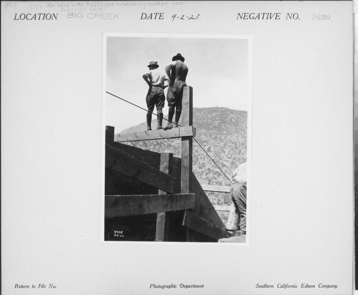 P1.1 - Group Portraits - Five Edison Executives & Engineers watching the turning on of Powerhouse #8. [ L-R: Edwin R. Davis - Superintendent Hydro Gen., Dave H. Redinger - Resident Engineer Big Creek Project, Russell H. Ballard - VP & Gen. Mgr., George C. Ward - VP Operations & Construction, and Herbert A. Barre]