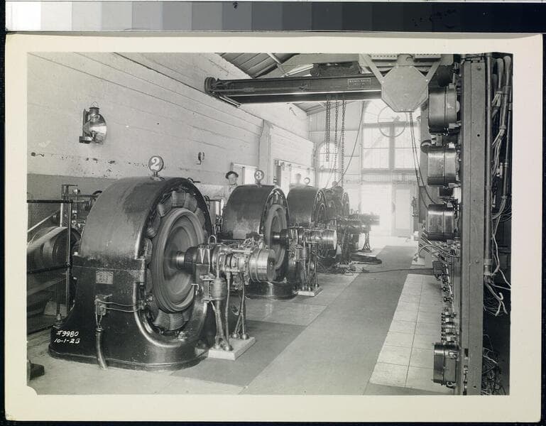Azusa Powerhouse - Powerhouse interior - Units #2, 3, & 4 on left; switchboard on right