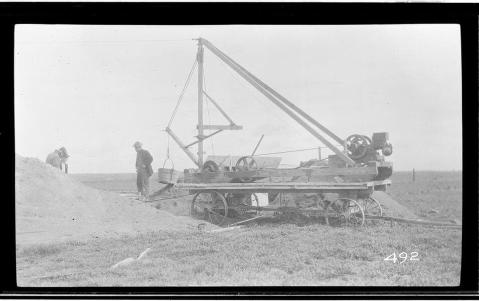 A working crew standing next to well drilling outfit in Tulare County.