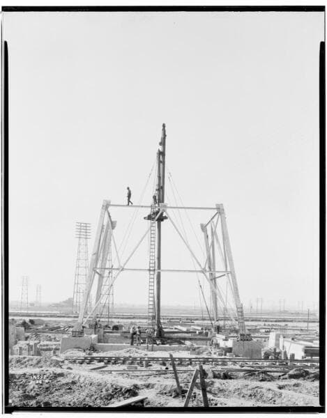 Long Beach Steam Station, Plant #3 - General view erecting 310' tower on North side of Channel.