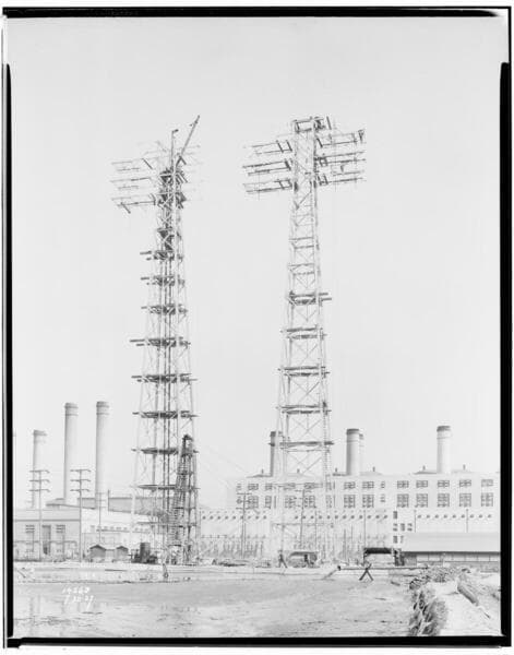 Long Beach Steam Station, Plant #3 - Close-up 230' towers showing insulators, wires, etc.