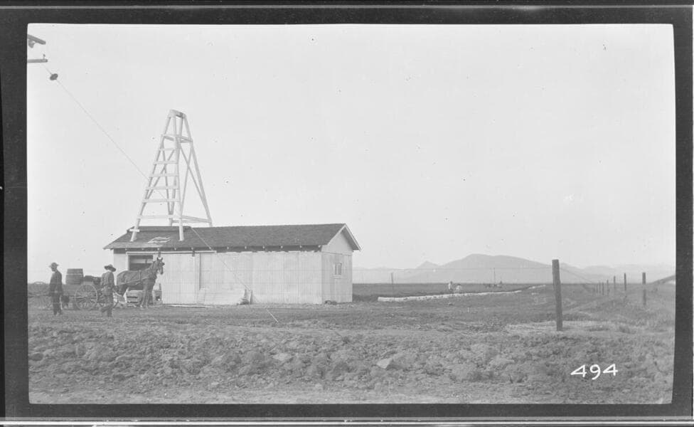 Two men and a horse-drawn cart standing outside a pumping plant in Tulare County