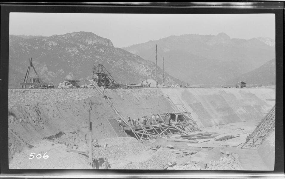 A construction crew working on the regulating reservoir at Kaweah #3 Hydro Plant