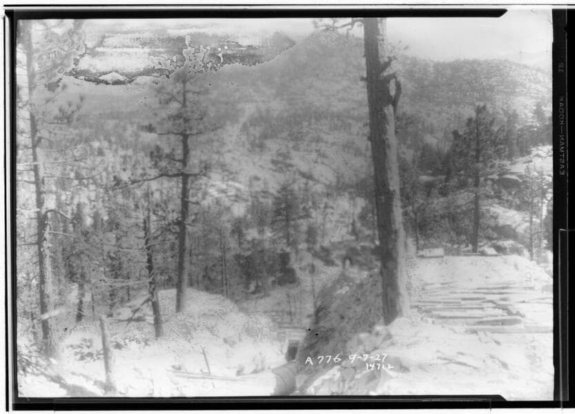 Big Creek, Mono-Bear Diversion - Looking northeast towards Camp 84 along Mono-Bear siphon from side of anchor #13 at Station 13+63. Part of this anchor appears in lower left corner of picture.