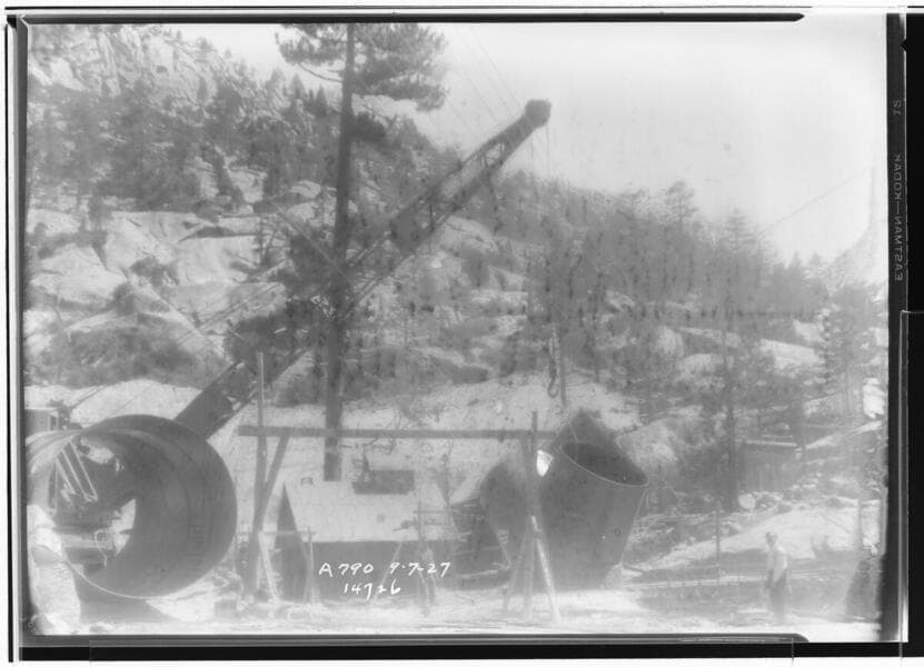 Big Creek, Mono-Bear Diversion - Excavation of Mono-Bear Siphon in progress between top of hill north of San Joaquin river and outlet of Mono and Bear tunnels.