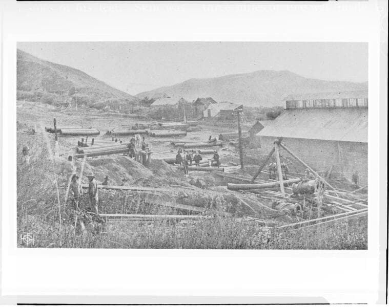 A construction crew making cement pipe for the waterway at Mill Creek #3 Hydro Plant, ca. 1902.