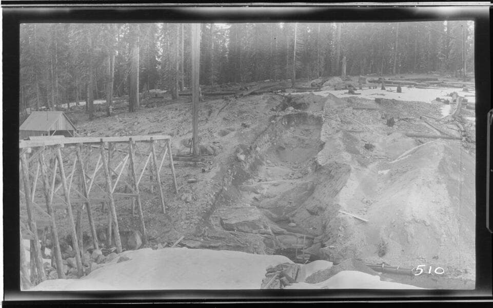 A wooden shack in a snow scene at Wolverton Reservoir, ca. Spring 1914.