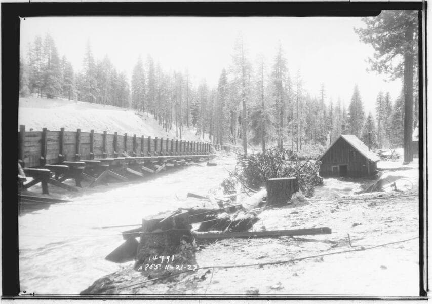 Big Creek, Florence Lake Dam - Fallen flume alongside reach below Ward Tunnel outlet. The trees which have fallen into the channel have either been removed entirely or else have been trimmed of branches, a certain amount of which has been placed against the bank at the left of the picture to aid in preventing further washing. The Link Belt shovel is now at work moving along up-stream in the bed of the new channel and throwing rocks over against the bank in the way of rip-rap. .