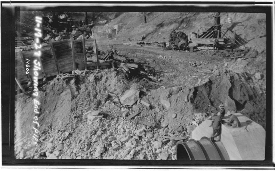 Big Creek, Florence Lake Dam - Flume along reach below Ward tunnel outlet - The house which is located near the barn, having been undermined has fallen and broken in two. This building has since been removed.