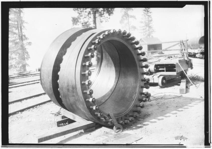 Powerhouse 2a - Gantry crane handling the forged seamless penstock pipe on inclined railroad above Powerhouse #2A.