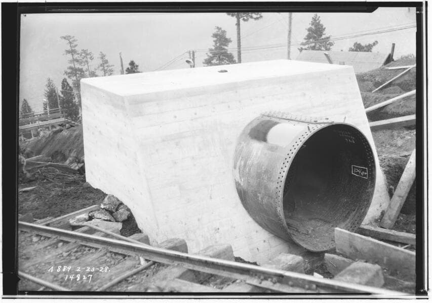 Powerhouse 2a penstock - Looking uphill from the S. J. & E. RR crossing at West Portal Anchor #5, and the surge chamber alongside it. Anchor #5 still has the concrete forms on it.