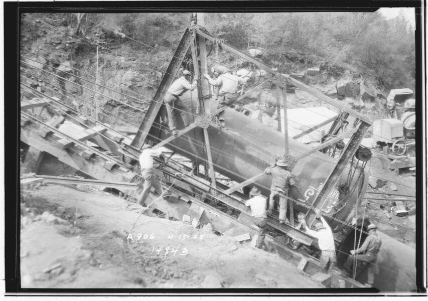 Powerhouse 2a - Gantry crane handling the forged seamless penstock pipe on inclined railroad above Powerhouse #2A.