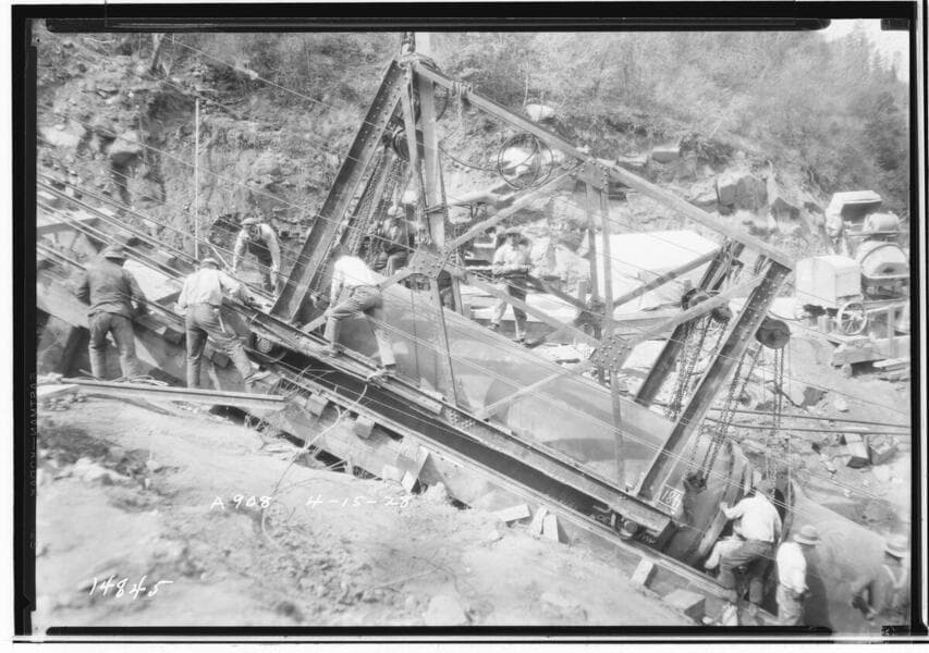 Powerhouse 2a - Gantry crane handling the forged seamless penstock pipe on inclined railroad above Powerhouse #2A.