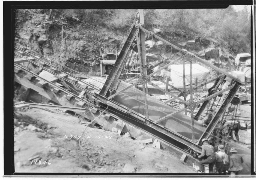 Powerhouse 2a - Gantry crane handling the forged seamless penstock pipe on inclined railroad above Powerhouse #2A.