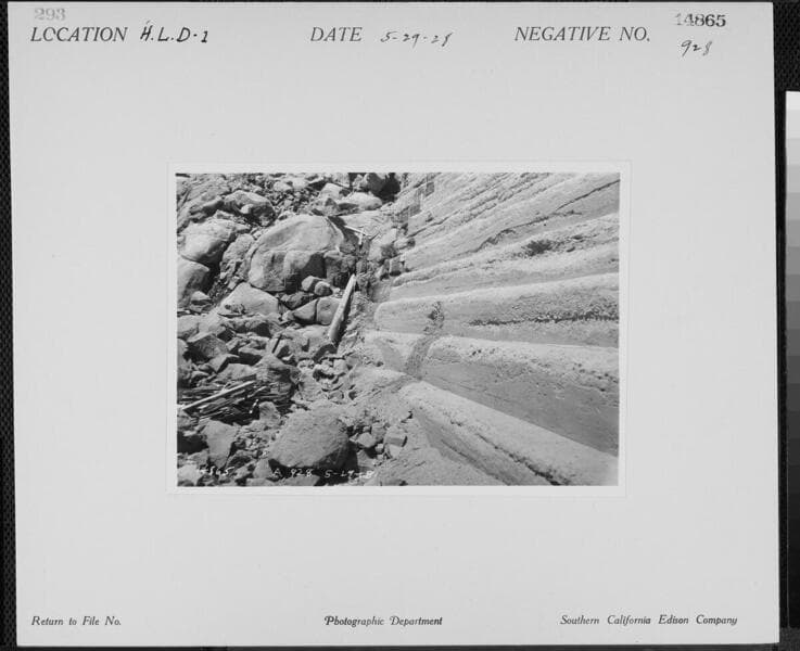 Big Creek Huntington Lake Dams - Dam #1 [rubble and boulders against downstream face near sluice gate outlets].