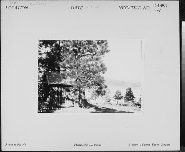 Big Creek Huntington Lake Dams - View of Huntington Lake [with a cabin on the shore and the top of one of the Dams near the end of construction.]