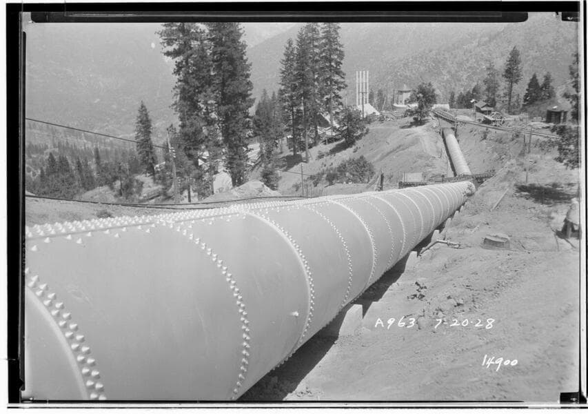 Powerhouse 2a penstock - Looking downhill along riveted portion of Penstock 2A just above the surge chamber at the outlet of tunnel No. 2.